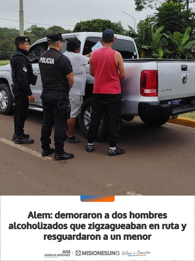 AGENCIA MISIONES.UNO | Dos hombres fueron demorados tras ser detectados conduciendo de manera peligrosa y bajo los efectos del alcohol sobre la Ruta Provincial N.º 4, en Leandro N. Alem. En el vehículo viajaba un menor de 12 años, quien fue resguardado por personal policial.
